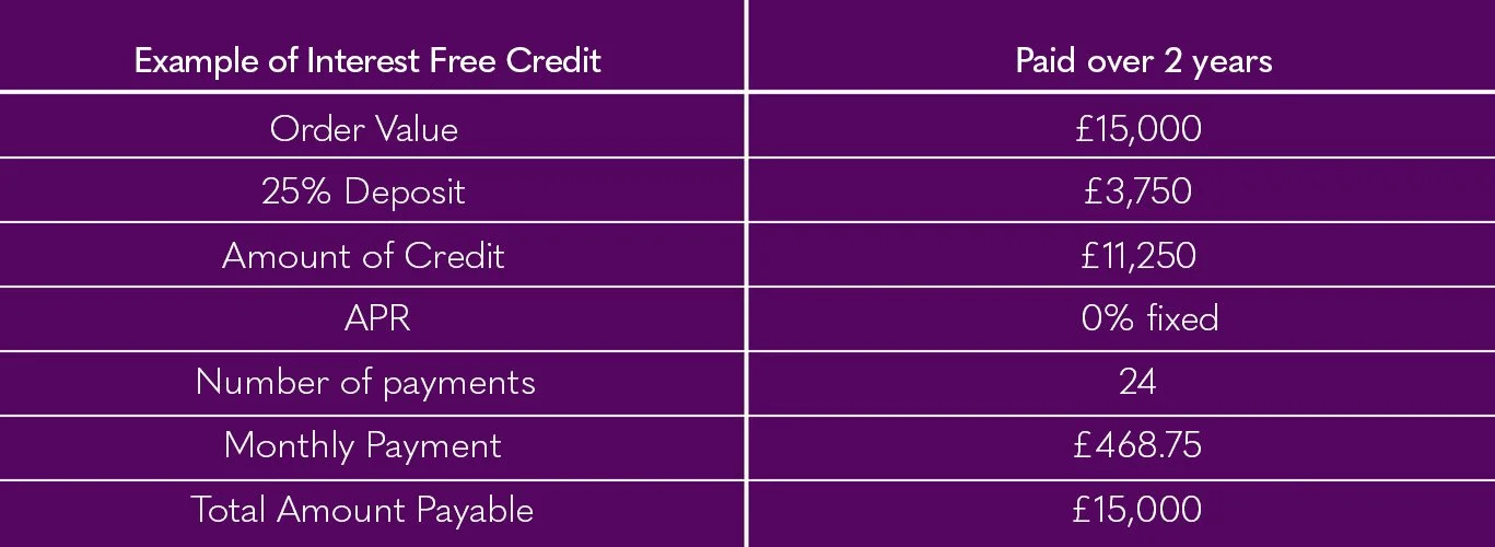 A minimum spend of £5,000 is required and a deposit payment of 10% deposit on order. Interest is calculated from day one once the deferral period ends at a rate of 12.9% APR Representative. Your first payment is due after the initial 12 month payment holiday.