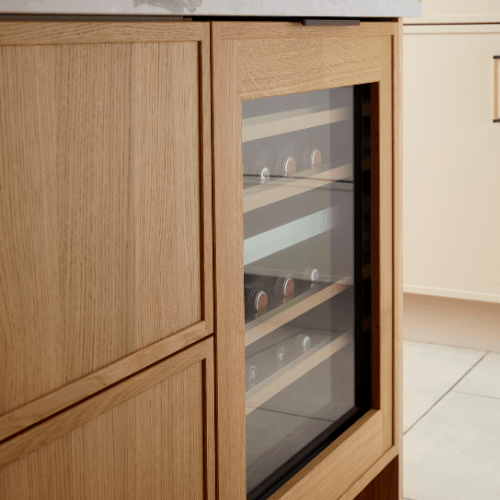 In wood kitchens, this is particularly effective. Lighter oak and real wood veneer benefit from the reduced framing, as it allows the natural variation of the timber to become the focal point rather than the door structure.